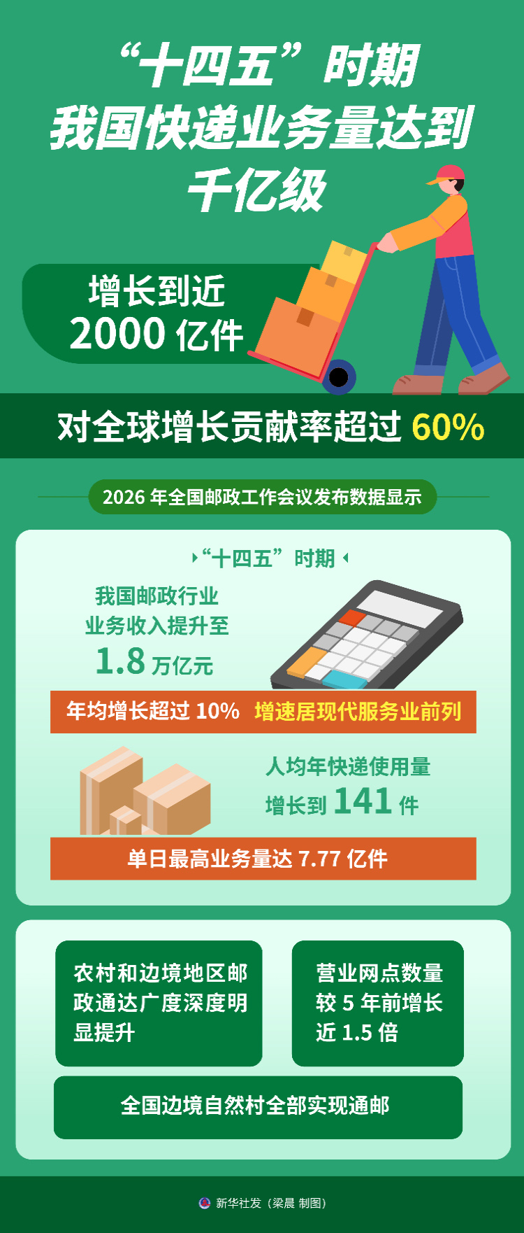 數(shù)據(jù)顯示,“十四五”時期,我國郵政行業(yè)業(yè)務(wù)收入提升至1.8萬億元,年均增長超過10%,增速居現(xiàn)代服務(wù)業(yè)前列;人均年快遞使用量增長到141件,單日最高業(yè)務(wù)量達(dá)7.77億件。