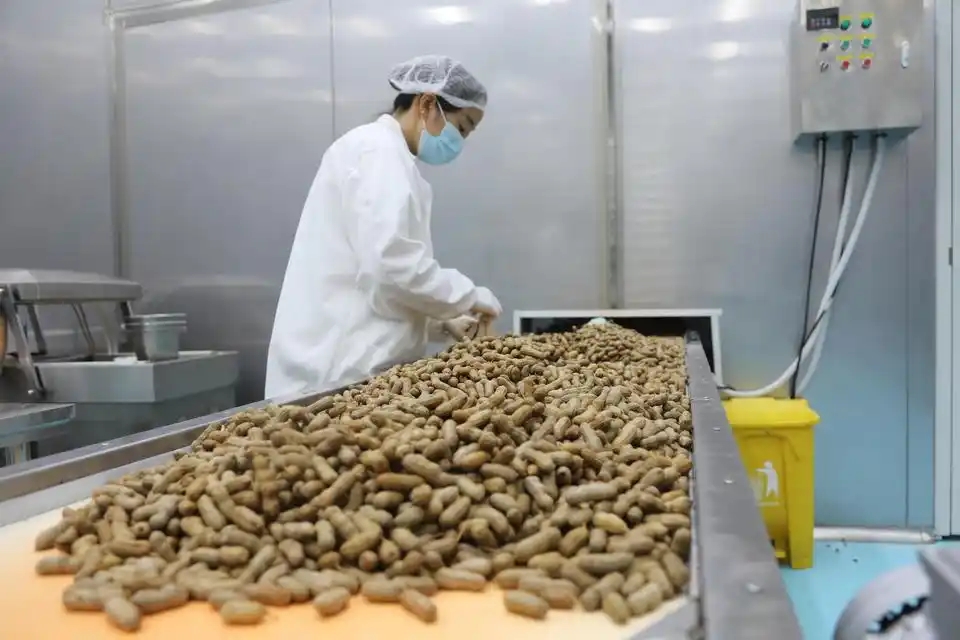 麥果果生產(chǎn)車間內(nèi)工人正在分揀花生。(范子明攝)