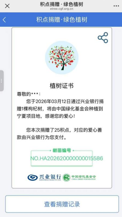 “積點(diǎn)捐贈(zèng)植樹(shù)”活動(dòng)以“小積點(diǎn)”撬動(dòng)“大公益”,客戶(hù)通過(guò)手機(jī)銀行即可使用所持積點(diǎn)捐贈(zèng)枸杞樹(shù)苗,一鍵參與綠色生態(tài)共建。捐贈(zèng)完成后,中國(guó)綠化基金會(huì)將為每位參與者頒發(fā)專(zhuān)屬電子植樹(shù)證書(shū),讓每一份綠色貢獻(xiàn)有跡可循、有愛(ài)可記。興業(yè)銀行將捐贈(zèng)苗木數(shù)量按規(guī)則精準(zhǔn)折