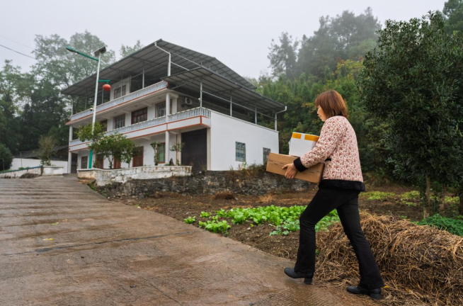 ▲劉美容為取貨不便的村民提供快遞送貨上門服務(wù)。李雨恒▕攝