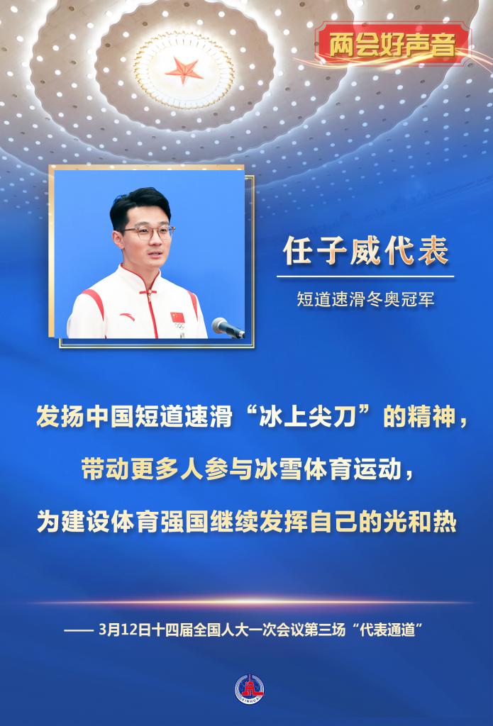 全國(guó)人大代表、短道速滑冬奧冠軍任子威說,將繼續(xù)為國(guó)出征,發(fā)揚(yáng)中國(guó)短道速滑‘冰上尖刀’的精神,帶動(dòng)更多人參與冰雪體育運(yùn)動(dòng),為建設(shè)體育強(qiáng)國(guó)繼續(xù)發(fā)揮自己的光和熱。