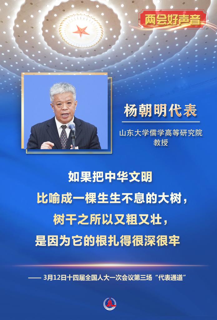 山東大學(xué)儒學(xué)高等研究院教授楊朝明代表講述了從事中國(guó)傳統(tǒng)文化研究的體會(huì)。“如果把中華文明比喻成一棵生生不息的大樹,樹干之所以又粗又壯,是因?yàn)樗母煤苌詈芾?。這是我們中華民族的突出優(yōu)勢(shì)之一,是我們深厚的文化軟實(shí)力?!?/p>