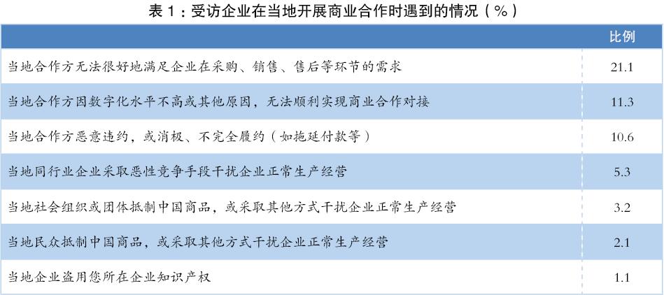 在企業(yè)面臨的商業(yè)誠信問題方面,超兩成受訪企業(yè)表示“當?shù)睾献鞣綗o法很好地滿足企業(yè)在采購、銷售、售后等環(huán)節(jié)的需求”,這也是受訪企業(yè)面臨的最主要挑戰(zhàn)。另外分別有約一成企業(yè)面臨著受當?shù)丶夹g(shù)條件限制無法與當?shù)睾献鞣巾樌麑崿F(xiàn)商業(yè)對接的困境,或是受到當?shù)睾献鞣綈阂膺`約、消極履約行為的掣肘。(見表1)
