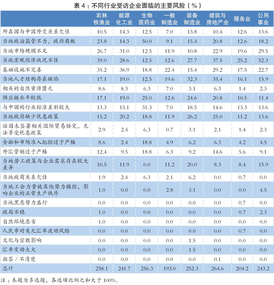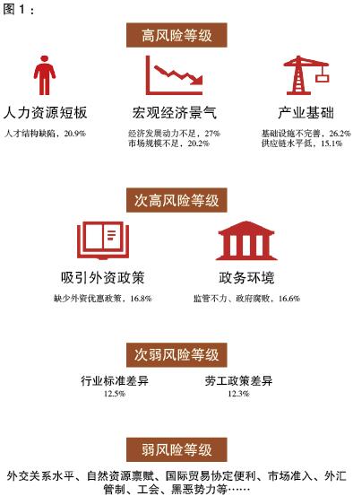 在調(diào)查問卷中,研究人員列出了中國企業(yè)在“一帶一路”沿線國家投資運行可能面臨的24項主要風(fēng)險,并根據(jù)受訪企業(yè)的應(yīng)答結(jié)果對風(fēng)險的嚴重等級進行了分類。研究結(jié)果顯示,處在“高風(fēng)險等級”的因素是人力資源短板、宏觀經(jīng)濟景氣不佳與產(chǎn)業(yè)基礎(chǔ)薄弱;處在“次高風(fēng)險等級”的主要是政府與政策問題,即政務(wù)環(huán)境、招商引資優(yōu)惠政策問題。相對地,行業(yè)標準差異、勞工政策差異、自然資源稟賦、市場準入、外匯管制、外交關(guān)系、社會環(huán)境等因素的風(fēng)險系數(shù)較低。