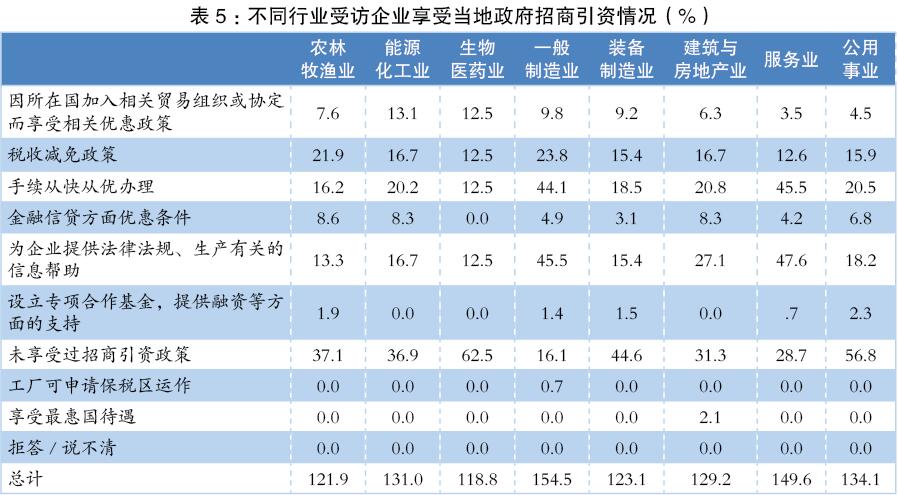 對于企業(yè)是否享有當?shù)卣猩桃Y等優(yōu)惠,不同行業(yè)也存在著差異。(見表5)
