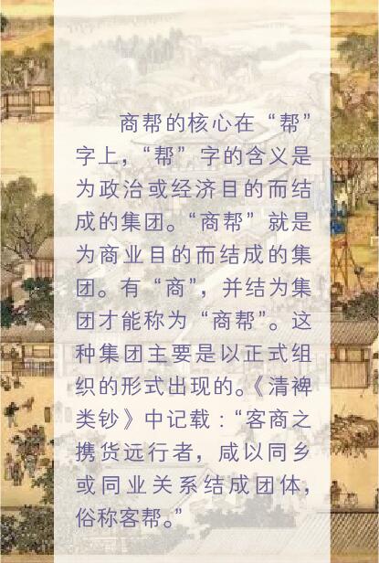 從字面意義上看,商幫的核心在“幫”字上,“幫”字的含義是為政治或經(jīng)濟(jì)目的而結(jié)成的集團(tuán)。“商幫”就是為商業(yè)目的而結(jié)成的集團(tuán)。有“商”,并結(jié)為集團(tuán)才能稱(chēng)為“商幫”。這種集團(tuán)主要是以正式組織的形式出現(xiàn)的。《清裨類(lèi)鈔》中記載 : “客商之?dāng)y貨遠(yuǎn)行者,咸以同鄉(xiāng)或同業(yè)關(guān)系結(jié)成團(tuán)體,俗稱(chēng)客幫?!?/p>