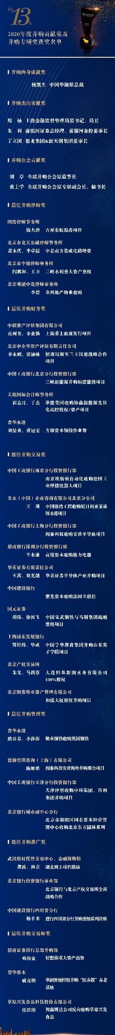 備受業(yè)界矚目的2020第十三屆并購專項獎在年會上如期揭曉。中國華融原總裁楊凱生獲得并購終身成就獎。上海金融監(jiān)督管理局原書記、局長鄭楊,前銀河證券總經(jīng)理、前銀河金控董事長朱利,德龍集團/新天鋼集團董事長丁立國分別獲得并購杰出貢獻獎。