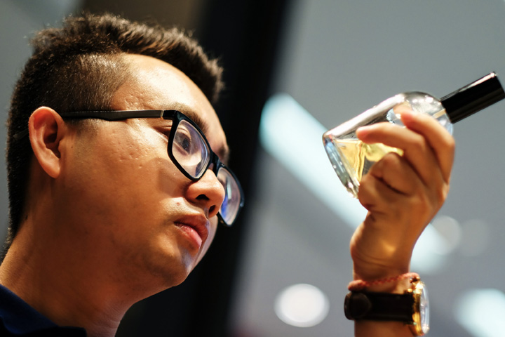 2016年5月26日,中國小伙陳宇在泰國曼谷一家精油美容用品商店里了解新上市的產(chǎn)品。
